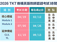 2025師德好讀月 滿額精美抽獎活動 2025師德好讀月 滿額精美抽獎活動 新書:全民英檢中級關鍵文法 新書:全民英檢中級關鍵文法 Super KK 音標 自然發音 Super KK 音標 自然發音 Reading Joy 閱讀教材 36個閱讀主題 STYLE 分級檢定 Reading Joy 閱讀教材 36個閱讀主題 STYLE 分級檢定 2025年YLE/KET/PET公開場 報名中 2025年YLE/KET/PET公開場 報名中 線上講堂PoeAI 教學應用課程 創意設計從教案到遊戲,打造有趣又有感的課堂流程 2025/12/21(日) 線上講堂班級情緒經營工作坊 兒童SEL × 教師調適 × 班級經營 2026/1/25(日) TKT劍橋英語教師認證2026 場次報名中 單一模組:2,100元 學生優惠價:1,850元單次報考三模組:5,550元 教學實務More 六個開學小活動分享 精選了 6 個有趣又好操作的教具玩法,讓老師輕鬆帶動氣氛、建立良好互動,幫助孩... 如何準備 Cambridge YLE? 劍橋兒童英語認證 YLE,是許多老師及家長都想讓孩子挑戰的一項英語測驗... TKT教師認證 STYLE/JET英語檢定 KITE幼兒檢定 劍橋YLE 劍橋KET/PET TKT劍橋英語教師認證 了解更多 TKT 核心模組:Module1、Module2、Module3TKT 延伸模組:CLIL、YL 索取簡章 2025考試日程 04/13台北/台中/高雄成績查詢 07/06台北/台中/高雄成績查詢 11/16台北/台中/高雄寄准考證:10/27 2026考試日程 04/19台北/台中/高雄報名 07/05台北/台中/高雄報名 11/15台北/台中/高雄報名 STYLE/JET 全國兒童暨青少年英語分級檢定了解更多 筆試:STYLE 1~6級/JET A~C級口試:STYLE 1~6級/JET級 索取簡章 2025考試日程 筆試05/04全國15個考區成績查詢 口試 04/12台南成績查詢 口試 06/22台北成績查詢 筆試11/09全國13個考區寄准考證10/27 口試 12/06台中報名期間01/14-10/29報名 口試 12/14台北報名期間01/14-11/05報名 KITE 全國幼兒英語檢定了解更多 筆試:KITE 1~2級口試:KITE級 索取簡章 2025考試日程 筆試06/08全國5個考區成績查詢 口試 04/12台南成績查詢 口試 06/22台北成績查詢 口試 12/06台中報名期間01/14-10/29報名 口試 12/14台北報名期間01/14-11/05報名 YLE劍橋兒童英語認證了解更多 Starters / Movers / Flyers 索取簡章 考試日程 2025/12/28台北報名 2026/02/01台北報名 2026/03/15台北(內湖考場)報名 2026/04/12台中報名 2026/06/14新竹報名 2026/07/05台北報名 KET/PET for Schools了解更多 KET for Schools / PET for Schools 索取簡章 2026考試日程 2026/01/25台北報名 2026/03/22台北報名 2026/04/19台中報名 2026/06/14新竹報名 2026/07/12台北報名 師德網路商城More 新多益神人完勝題庫(題型攻略+模擬試題+詳盡解析 + QR ... The TKT Course Young Learners ... 國中會考英聽全真題庫 (試題+解題攻略+QR CODE音檔)... We Love You, Mr. Panda 進口繪本... 套組-記憶吐司字卡+桌遊板(形容詞篇) 記憶吐司字卡Plus-桌遊板(形容詞篇) 可擦寫小白板(5入) (團購優惠)記憶吐司字卡-食物篇(五盒組)
