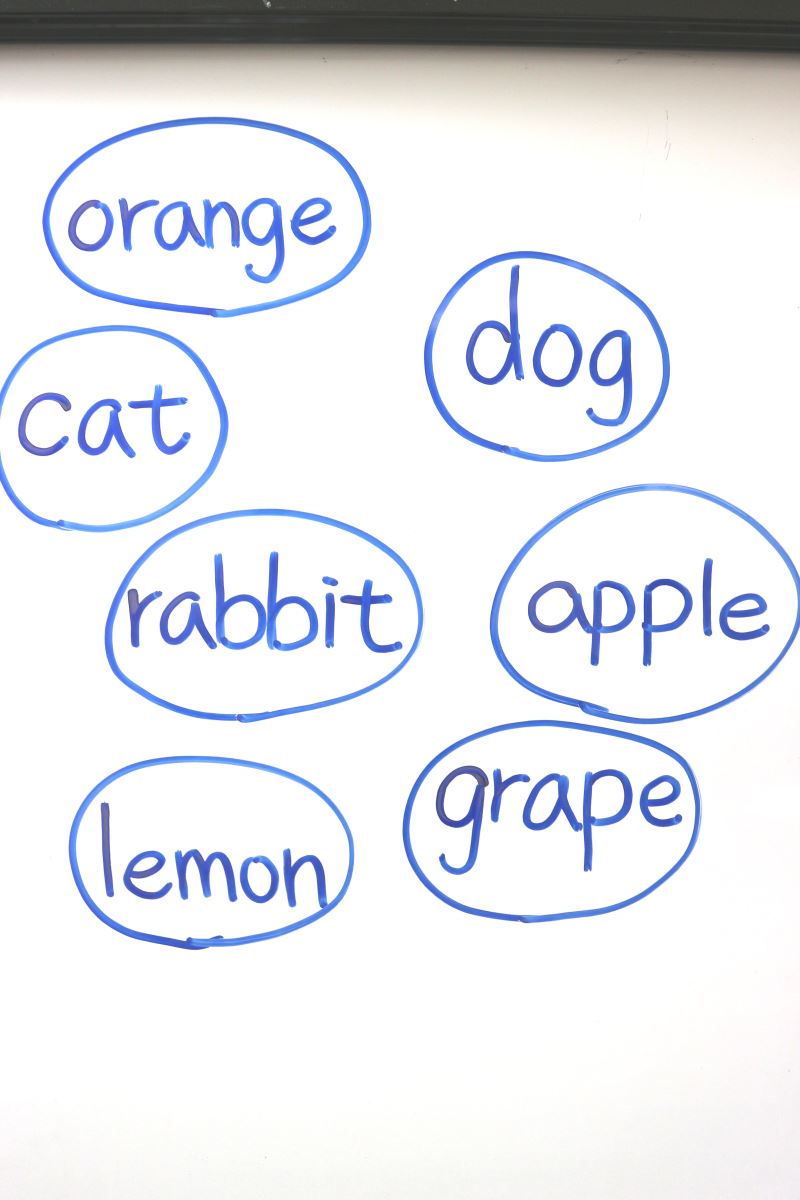 在教完一~三個單元的單字後,老師可從各單元中挑選出幾個常見單字,並寫在白板上,出題考學生:「白板上的單字中,哪些是水果類?」(類別可自由更換)